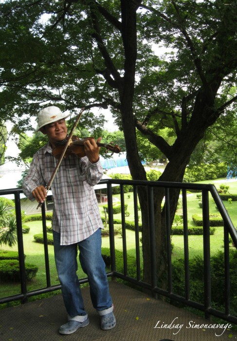 A Thai man plays his violin near River Kwai