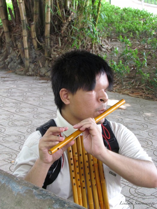 Agent Orange victim playing a gorgeous song on his bamboo flutes near Hoan Kiem Lake, Hanoi