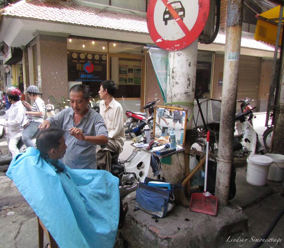A man gets his haircut at a street barber in Hanoi